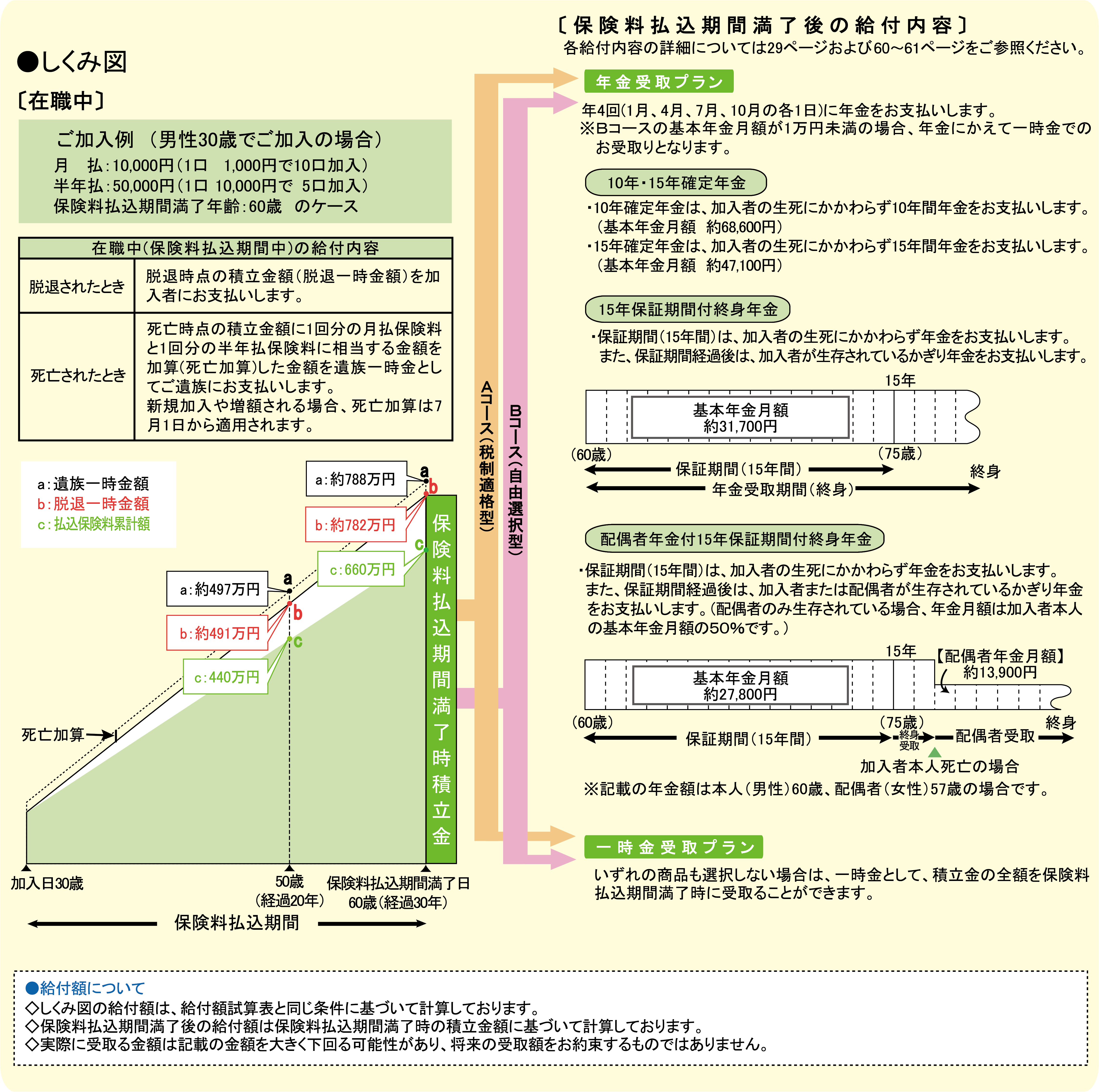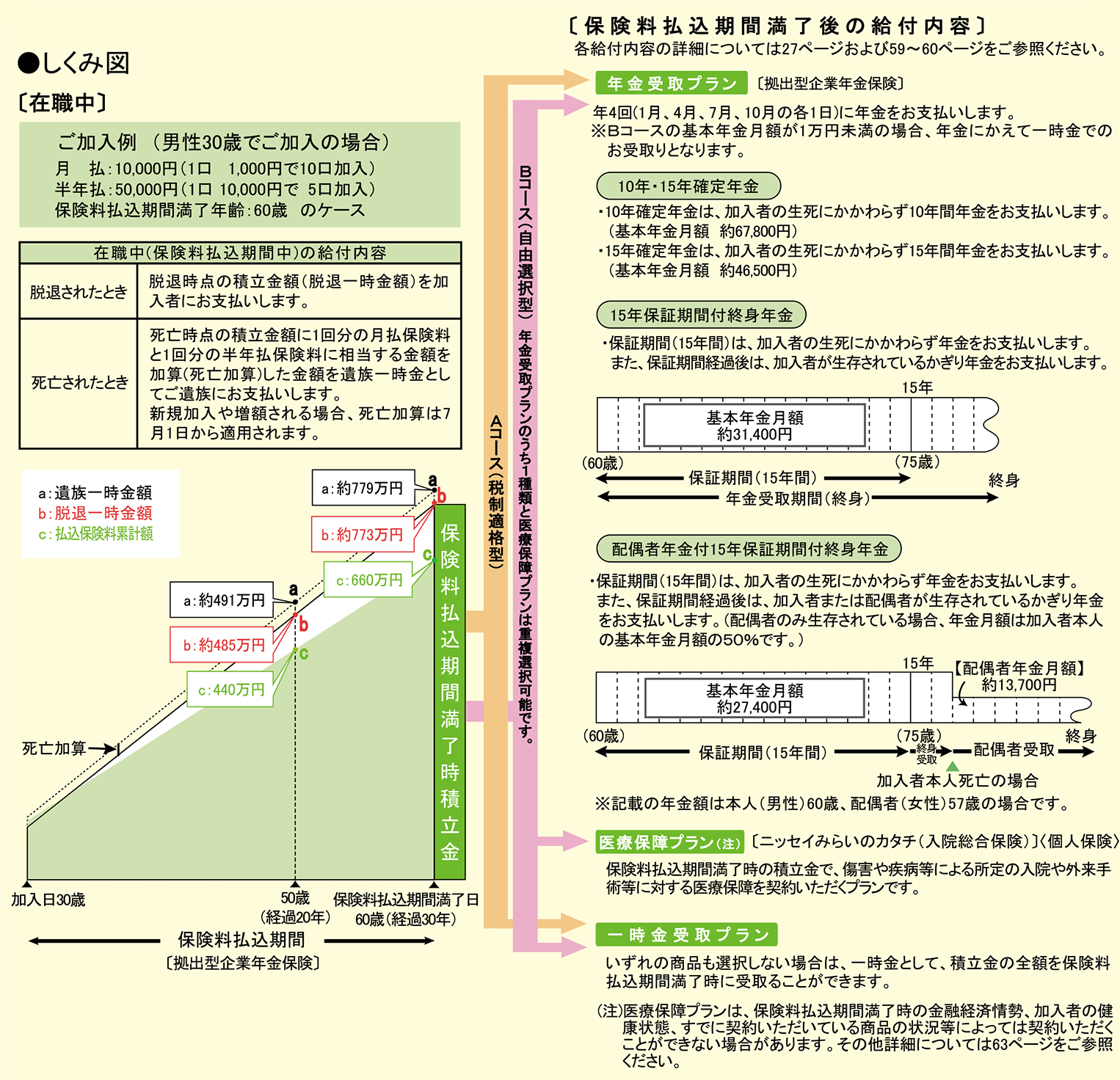 ●在職中に保険料を払込み、保険料払込期間満了後は、保険料払込期間満了時積立金額を原資とした年金をお受取りになれます。年金でのお受取りにかえて、一時金で受取ることもできます。また、Bコースの加入者は、「保険料払込期間満了後の給付内容」に記載の個人保険を選択いただくこともできます。