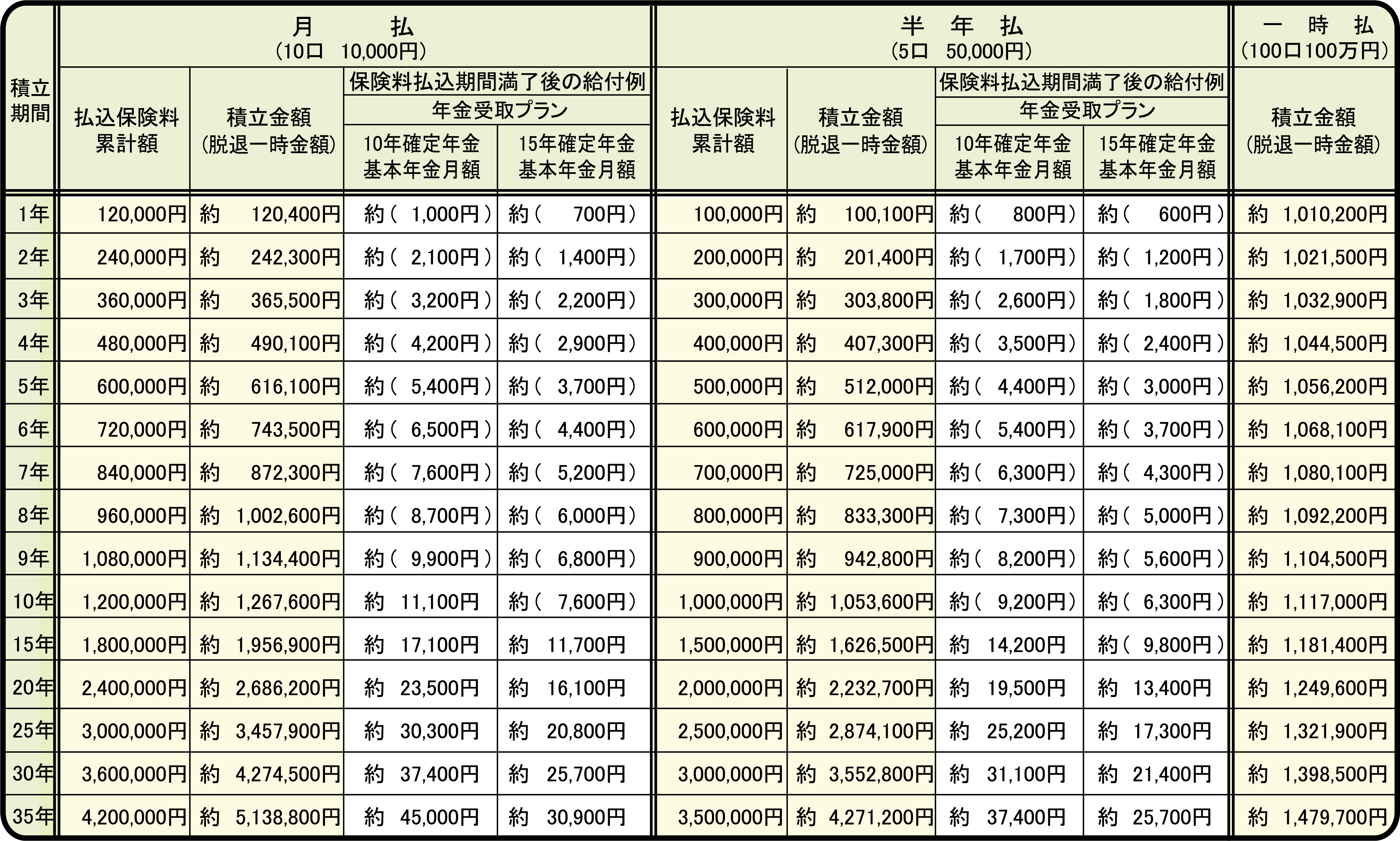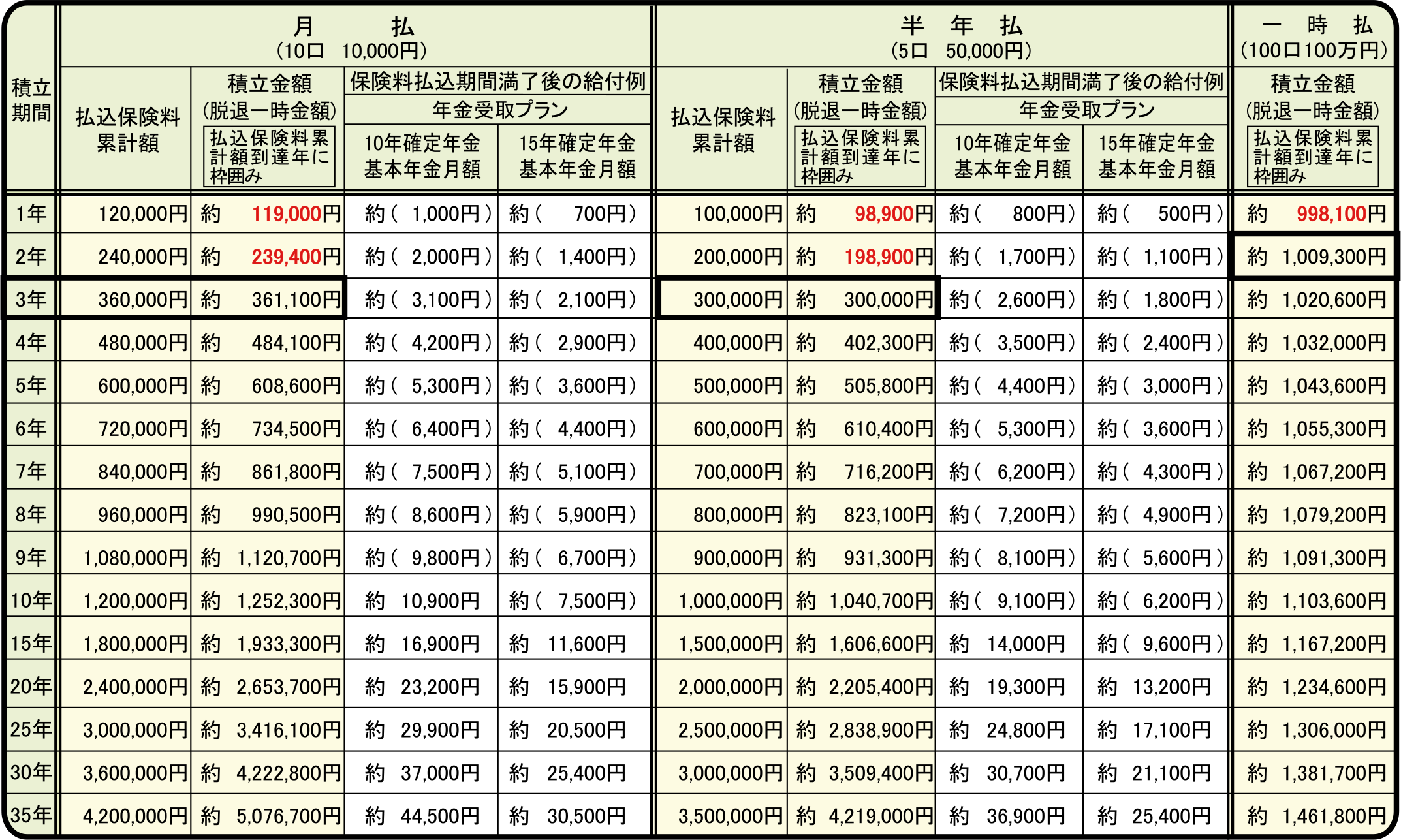 ◇月払10口 10,000円 半年払5口 50,000円 一時払100口 1,000,000円加入の場合